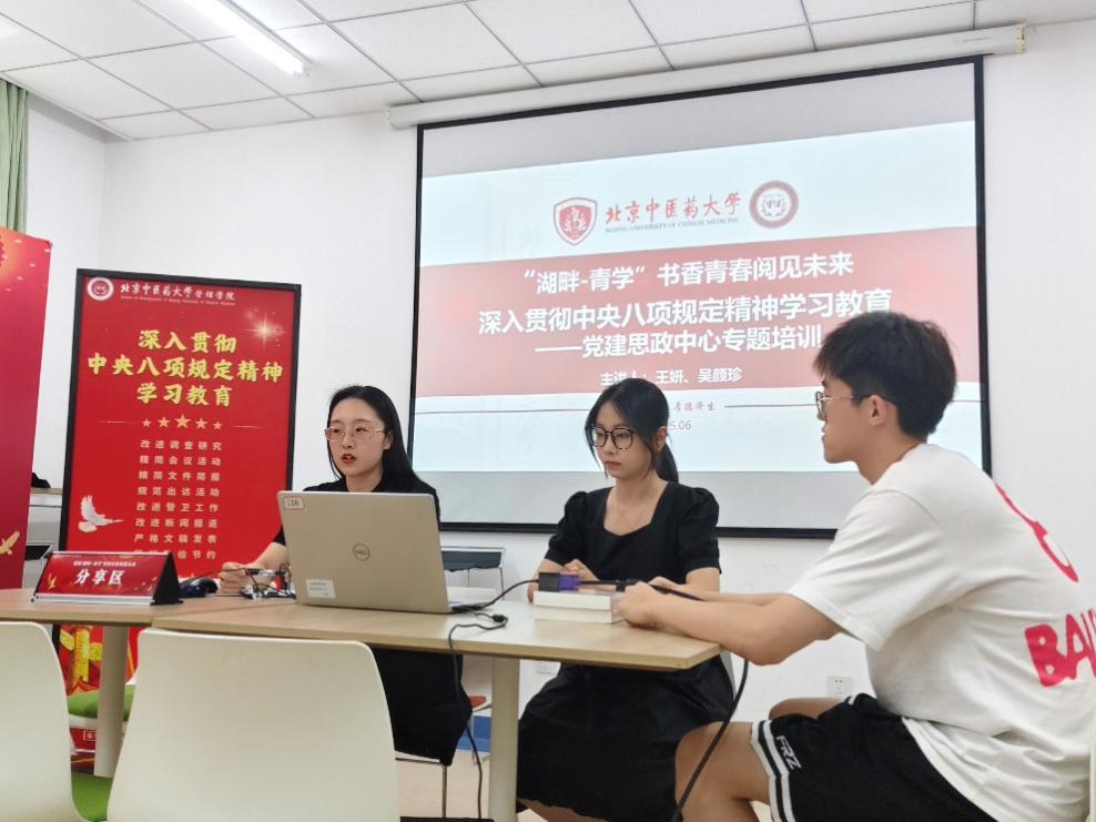 6月6日,支部邀请学院党委副书记周磊为支部全体党员、发展对象讲授《学习中央八项规定精神之党团建设》专题党课。在周磊书记的指导下,一支部强化政治引领,打造以党建带团建的学习模式。6月23日,支部书记王妍、支委吴颜珍在澳门十大信誉网赌大全“湖畔·青学”阅读室,进行《深入贯彻中央八项规定精神学习教育---党建思政中心专题培训》。6月25日,支部副书记范明惠、支委邓杰文为支部全体党员讲授《学习习总书记关于加强党的作风建设的重要论述》主题党课。6月26日,支部书记王妍为一支部全体党员讲授《以中央八项规定精神为纲,筑牢作风建设根基》专题党课。通过分层分类授课,突出抓好学生党员、学生干部学习教育并辐射广大学生,推动中央八项规定精神在学生群体中落地生根。