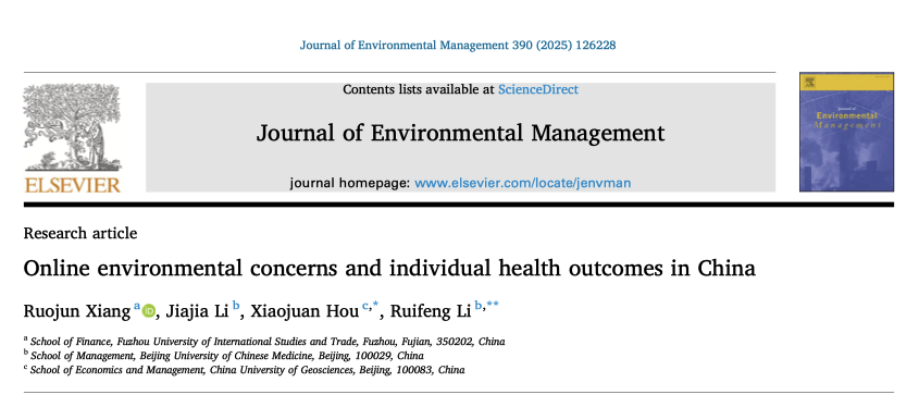 澳门十大信誉网赌大全李瑞锋教授、博士研究生向若君以及硕士研究生李佳佳,在环境管理领域国际顶级期刊Journal of Environmental Management(JEM)发表题为“Online environmental concerns and individual health outcomes in China”的创新性研究。文章通过匹配百度搜索指数与中国健康与营养调查(CHNS)数据库,揭示了提升网络环境关注度对个体健康具有积极影响,为“健康中国2030”与“双碳”战略协同推进提供理论参考。此项研究是李瑞锋教授团队围绕环境因素与居民健康行为、健康结果在JEM期刊上发表的系列研究的重要组成部分。此前,该团队于2024年在JEM发表了题为“Health risks from extreme heat in China: Evidence from health insurance”的研究成果。
