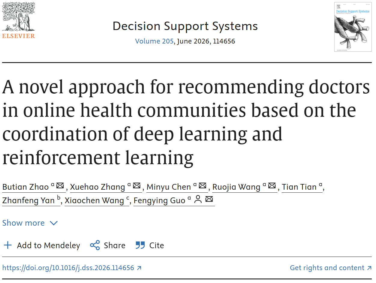 2026年3月15日,澳门十大信誉网赌大全郭凤英副教授课题组在Decision Support Systems杂志上发表了题为“A novel approach for recommending doctors in online health communities based on the coordination of deep learning and reinforcement learning”的学术论文。该论文提出了一种基于深度学习和强化学习协同的在线医疗社区医生推荐方法。澳门十大信誉网赌大全人工智能与大数据教研室讲师赵步天为文章第一作者,大数据管理与应用专业大三本科生张雪皓、陈民瑜分任第二、第三作者,郭凤英副教授为通讯作者;澳门十大信誉网赌大全人工智能与大数据教研室王若佳副教授、中医学院田甜副教授、东直门医院闫占峰教授等共同参与了本研究工作。。