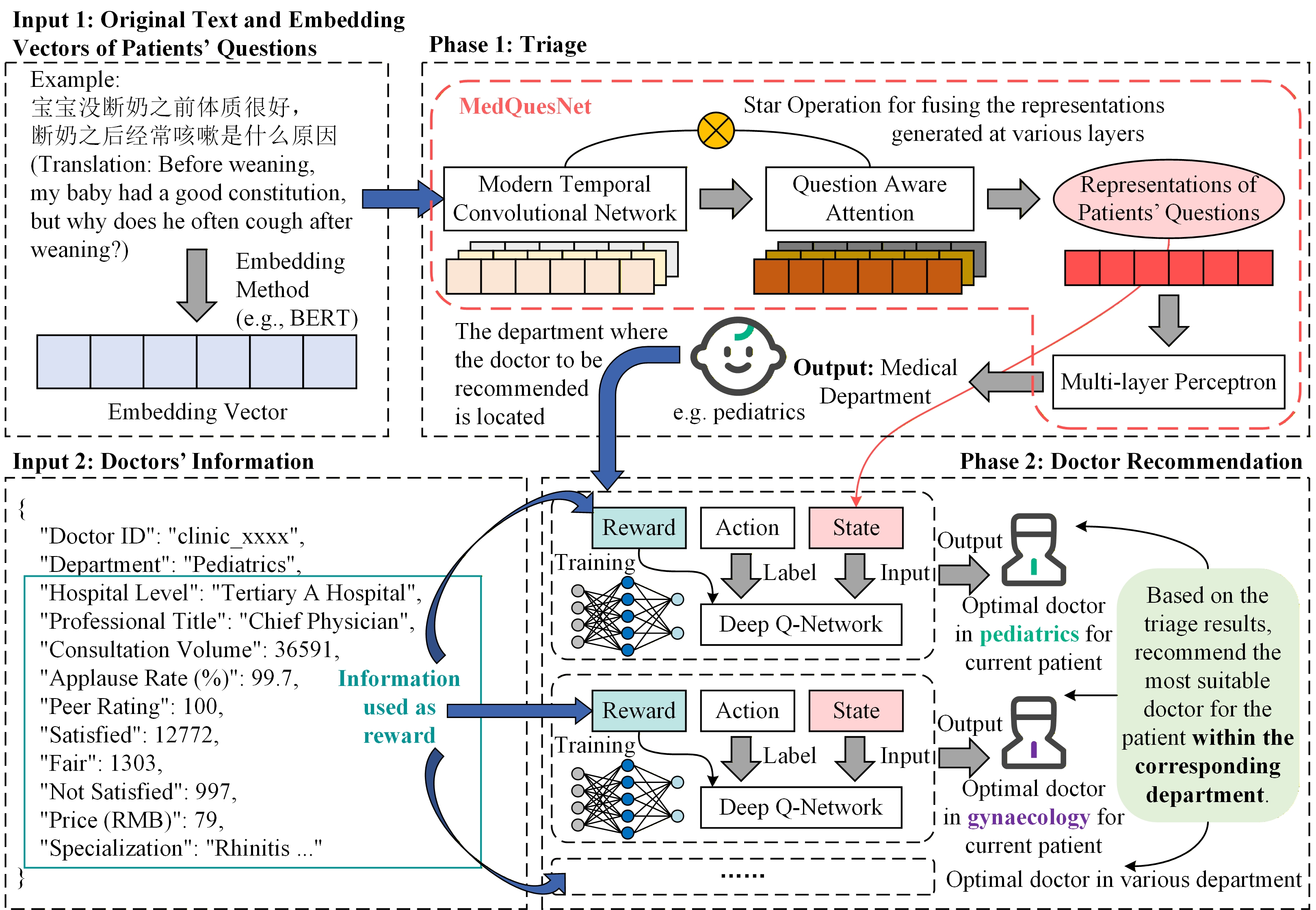 在线医疗社区近年来成为患者获取医疗信息和咨询医生的重要渠道,但如何在海量医生资源中实现高效、精准的医生推荐,仍然是智能医疗领域的重要研究问题。针对现有研究在标签有效性、推荐目标稀疏性和问诊文本的特殊性等方面存在的问题,研究团队提出了一种融合深度学习与强化学习的两阶段医生推荐新方法。该方法通过一个具有疑问句注意力机制的深度神经网络,将患者提出的问题转化为特殊的特征向量,进而映射到一个适合的科室,随后基于深度强化学习模型,结合医生的相关信息,为患者在科室内分配一个能有效回答其问题同时也能最大化其满意度的医生。