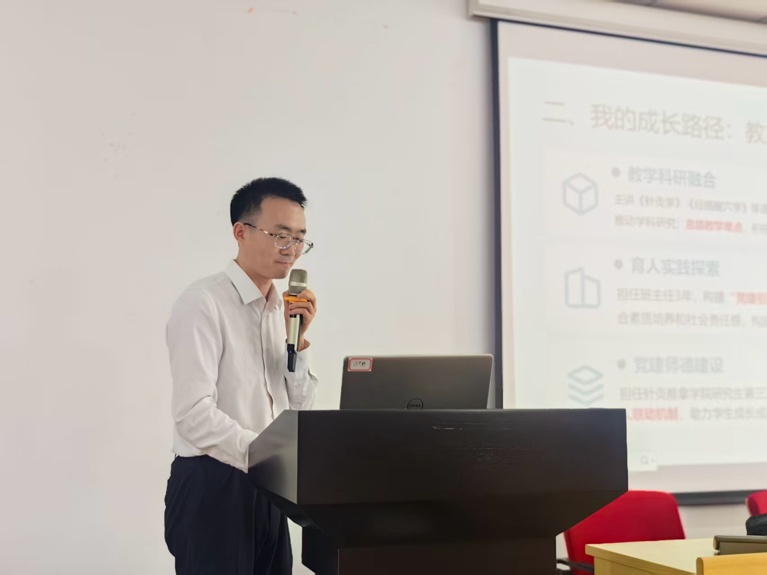 姜会梨副教授以《弘扬教育家精神,做新时代“四有”好老师》为主题,汇报其坚守“立德树人”初心的成长轨迹。他深度融合教育家精神与中医药教育,以“心有大我、至诚报国”的理想信念引领教学科研实践,主讲《针灸学》等课程并主持国家级课题,推动学科创新;担任班主任与党支部书记期间,构建“党建引领、针情常在”育人体系,通过义诊、抗疫服务等实践强化学生社会责任感,并依托班级活动与专业指导培育复合型人才,彰显了教育家精神在中医药领域的生动实践,为青年教师成长树立了典范。
