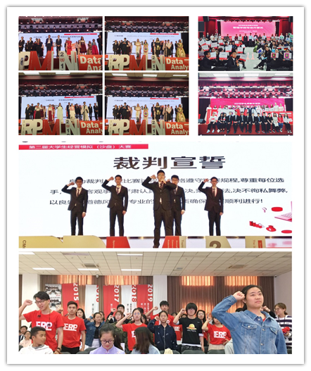 第二届大学生经营模拟(沙盘)大赛从大赛内容、往届回顾、报名情况、培训情况、选手风采方面进行了开幕展示。本届大赛参赛人数再创新高,来自各学院共计211名同学组成的55个“公司”参赛。开幕式上,有着国赛经历,作为上首届大学生经营模拟(沙盘)大赛技术指导,本届大学生经营模拟(沙盘)大赛裁判,来自17药事管理班的陈星宇同学,分享了他的沙盘心得,“作为一名中医药院校的学生,在学习医学专业知识的同时,也要培养与社会融洽相处的能力,沙盘就是一个很好的桥梁”。而后,为保证大赛的公平公正,裁判组代表、到场参赛选手进行宣誓。