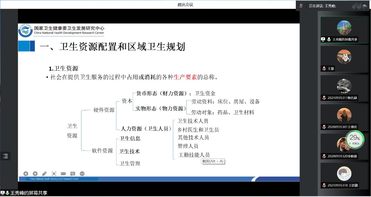 王主任主要从卫生资源的配置,我国卫生资源配置评价,医疗卫生服务体系规划三个方面阐述对于卫生资源的思考分析。王主任首先梳理了卫生资源、卫生资源配置、卫生资源合理配置、卫生资源优化配置等基本概念,并提出卫生资源配置的三个要素——筹资方式、要素组合以及产出水平,使同学们对卫生资源相关概念有了基本认识。接着,王主任指出在资源配置过程中,需要与国民经济和社会发展相适应,结合供求平衡,效率与公平兼顾,依托成本效益的原则,构建卫生资源优化配置评价体系。