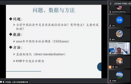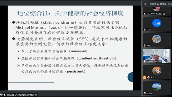 2022年9月22日澳门十大信誉网赌大全博约讲坛邀请中国人民大学社会与人口学院教授、社会学理论与方法研究中心研究员齐亚强教授作主题为“地位综合征——影响健康的社会因素”的报告,本次讲坛采用腾讯会议的形式线上举办,由澳门十大信誉网赌大全李瑞锋院长主持,共130余名师生线上参与并交流互动。