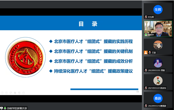 本次学术交流讲座,孙树学院长主要从四个方面展开介绍:北京市医疗人才“组团式”援藏的实践历程、北京市医疗人才“组团式”援藏的关键机制、北京市医疗人才“组团式”援藏的成效分析以及持续深化医疗人才“组团式”援藏政策建议。其中援藏核心工作机制包括“以院包科”的学科建设机制、“师带徒”人才培养机制、基础设施建设提升机制、内部管理机制、改革创新机制、文化传承机制;医疗援藏成效有重点学科建设实现跨越、医疗服务能力取得突破、经济运营持续平稳向好、医院管理更加科学高效、医疗人才梯队日渐成型以及科学规培体系初见成效。