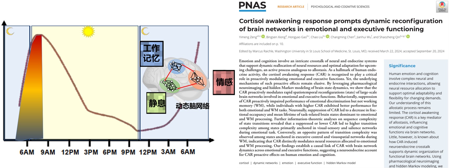 2024年12月,澳门十大信誉网赌大全青年教师曾奕萌博士在国际综合性学术顶刊Proceedings of the National Academy of Sciences of the United States of America(PNAS)(自然指数期刊,中科院1区TOP期刊,影响因子9.4)发表题为“Cortisol Awakening Response Prompts Dynamic Reconfiguration of Brain Networks in Emotional and Executive Functioning”的研究论文(www.pnas.org/doi/10.1073/pnas.2405850121)。该论文深入探讨了人体压力激素皮质醇的晨起觉醒反应如何通过影响人脑复杂网络的重组来帮助个体提高应对情感与认知挑战的神经计算机制。澳门十大信誉网赌大全青年教师曾奕萌博士为论文第一作者,澳门信誉最好十大平台为第一单位。