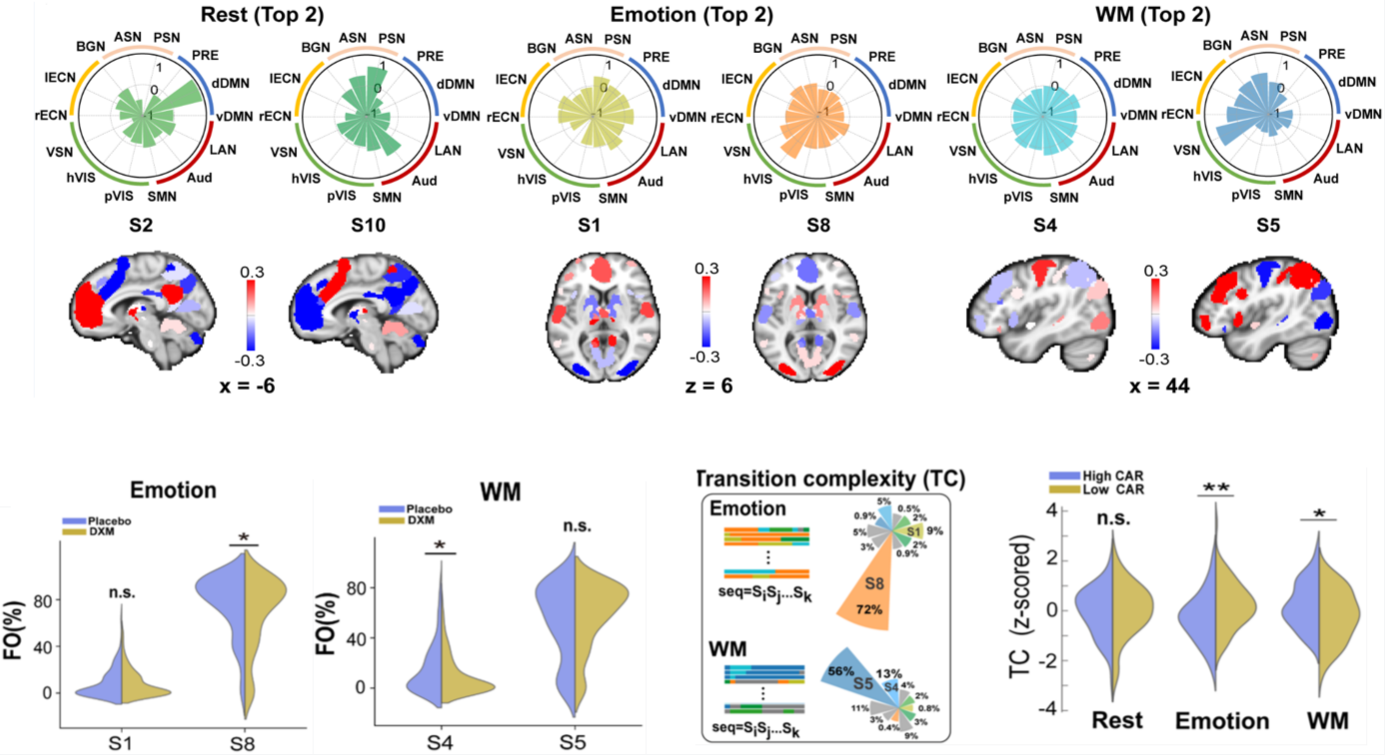 为此,澳门十大信誉网赌大全青年教师曾奕萌博士与北京师范大学认知神经科学与学习国家重点实验室科研团队合作,基于随机对照实验设计(Randomized Controlled Trial, RCT),采用药物方法因果性地操纵个体的CAR水平并探究其如何影响个体情感与认知功能。研究同时结合了高场强功能磁共振成像(fMRI)与前沿的动态脑网络的机器学习建模方法,深入探究了CAR调控关键情感脑网络与认知脑网络的神经计算机制。研究首先发现CAR提高了个体在情感与认知任务中的行为表现,呈现出正向支持作用。进一步的,通过解码个体人脑网络快速重组模式,我们发现CAR显著改变了个体在执行情感与认知任务中的核心脑网络的动态重组模式。最后,借助统计物理方法对人脑网络系统切换复杂度进行测算,研究还发现CAR通过灵活的神经资源分配(neural resource allocation),调节了情感与认知过程中的特异性状态编码模式,从而实现了系统能量在情感功能与认知功能间的灵活分配。