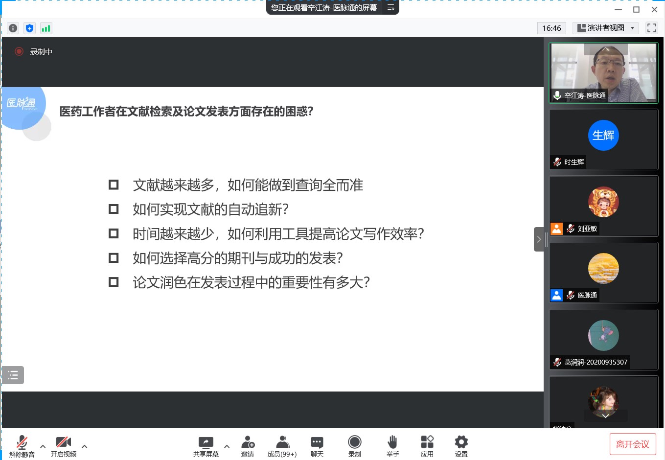 2022年5月19日下午14:00,澳门十大信誉网赌大全“博约讲坛”系列学术交流活动第34讲通过线上腾讯会议的形式顺利开展,本次论坛由医疗大数据与信息管理教研室协办,邀请到医脉通副总裁辛江涛做报告。报告主题为“如何实现文献检索与论文写作的效率提升”,本期学术交流活动由澳门十大信誉网赌大全王慧副院长主持,共有160余名师生线上参与并交流互动。